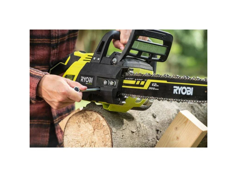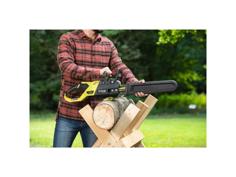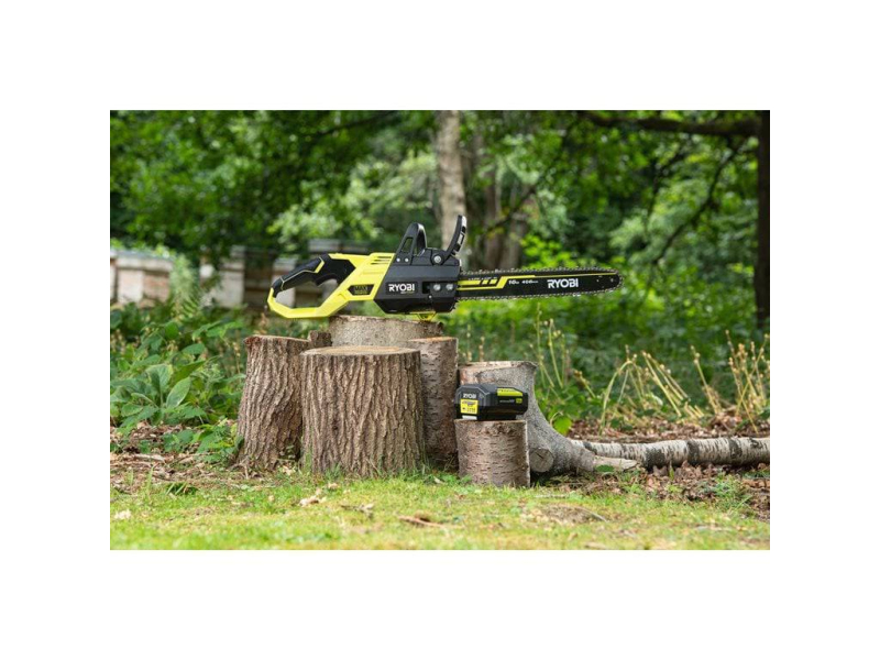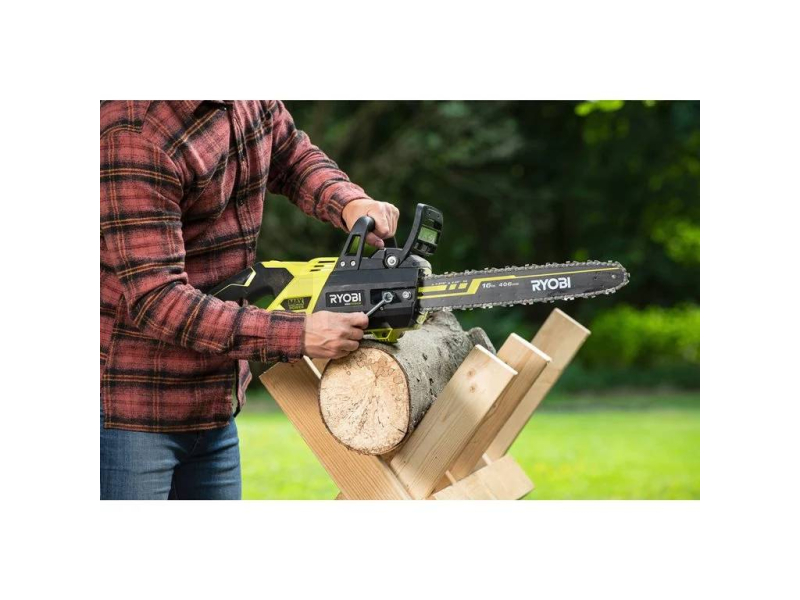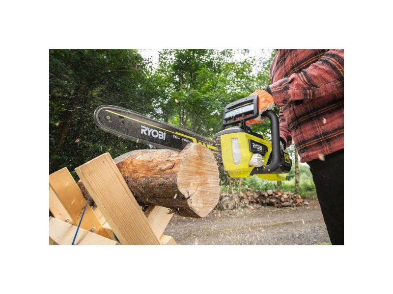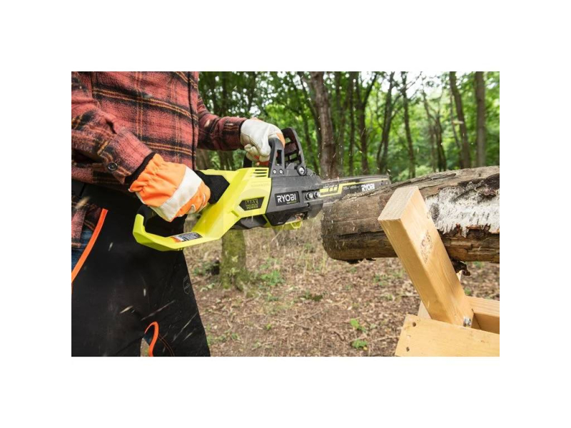 RYOBI RY36CSX40B-0 je výkonná 36V bezuhlíková akumulátorová řetězová pila s 40cm lištou, určená pro rychlé, bezpečné a plynulé řezání středně velkých až velkých polen.