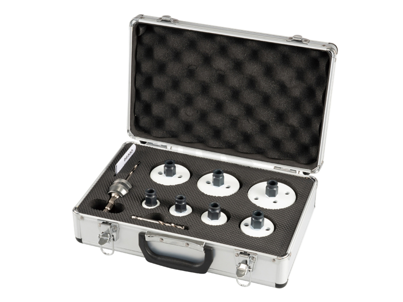 Sada v hliníkovém kufru obsahuje děrovky Ezychange2 o průměru 19, 22, 29, 38, 44, 57 mm a adaptér se středícím vrtákem HSS-G.