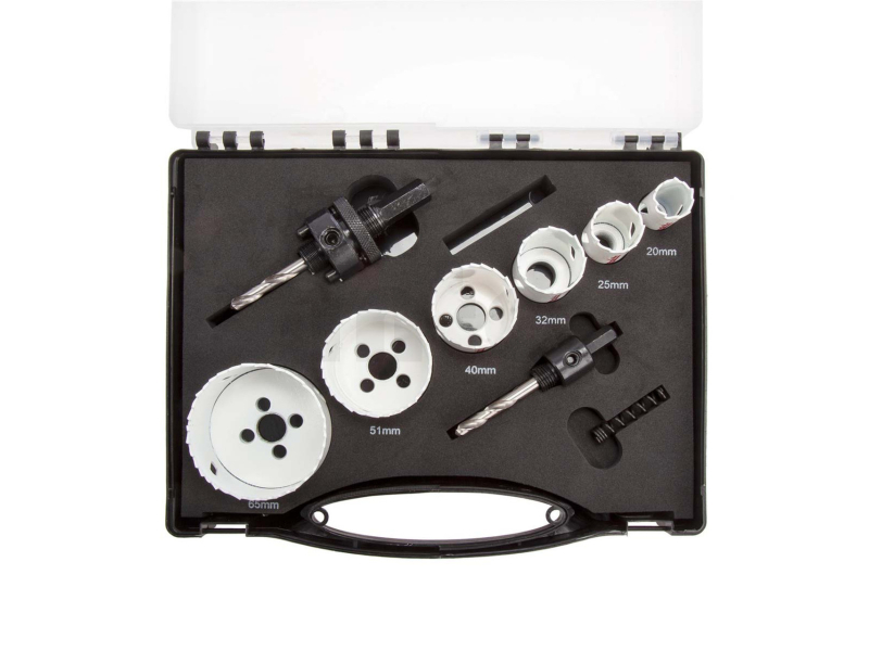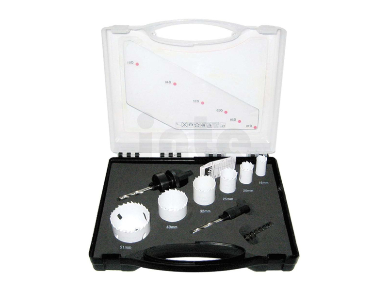 Sada obsahuje BiM korunky o průměru 20, 25, 32, 40, 51 a 65 mm, adaptér pro korunky 16-30 mm a adaptér pro korunky 32-152 mm. Korunky jsou vyrobené ze speciální oceli legované 8% kobaltem. Korunky jsou vhodné pro vyřezávání velmi přesných kruhových otvorů ve dřevě, hliníku, sádrokartonu, umělé hmotě, barevných kovech nebo tenké oceli. Speciální tvar zubů umožňuje velmi intenzivní používání s dlouhou životností. Maximální hloubka řezu je 38 mm, upínání nástroje šestihran nebo SDS-Plus.