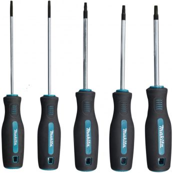 Sada obsahuje 5 ks šroubováků Makita Torx..Tyto šroubováky mají magnetický hrot a protiskluzovou rukojeť s praktickým označením velikosti na zadní straně. Sada obsahuje: T10x100 mm, T15x100 mm, T20x100 mm, T25x100 mm, T30x100 mm