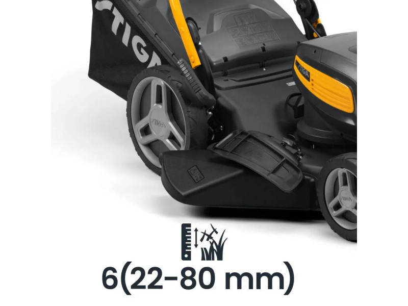 Robustní žací ústrojí o šířce 51 cm z galvanizované oceli zajišťuje velký pracovní záběr a mimořádnou odolnost. Sekačka umožňuje centrální nastavení výšky sečení v 6 polohách (22–80 mm), takže snadno přizpůsobíte výšku střihu aktuálním podmínkám trávníku.
