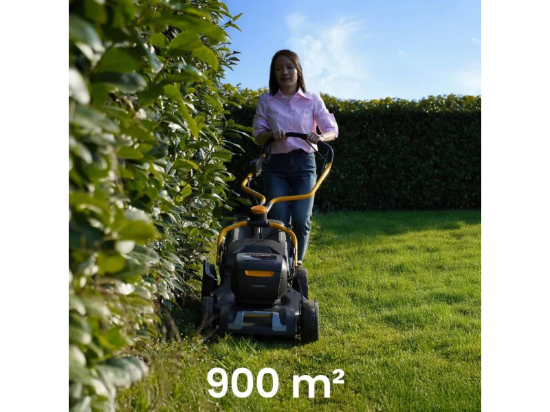Pro maximální komfort je sekačka vybavena pojezdem s elektronickým variátorem rychlosti (2,5–5 km/h) a možností volby šesti rychlostí. Praktický eco režim optimalizuje spotřebu energie a prodlužuje dobu provozu při méně náročném sekání.