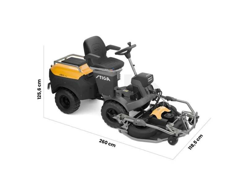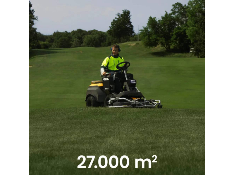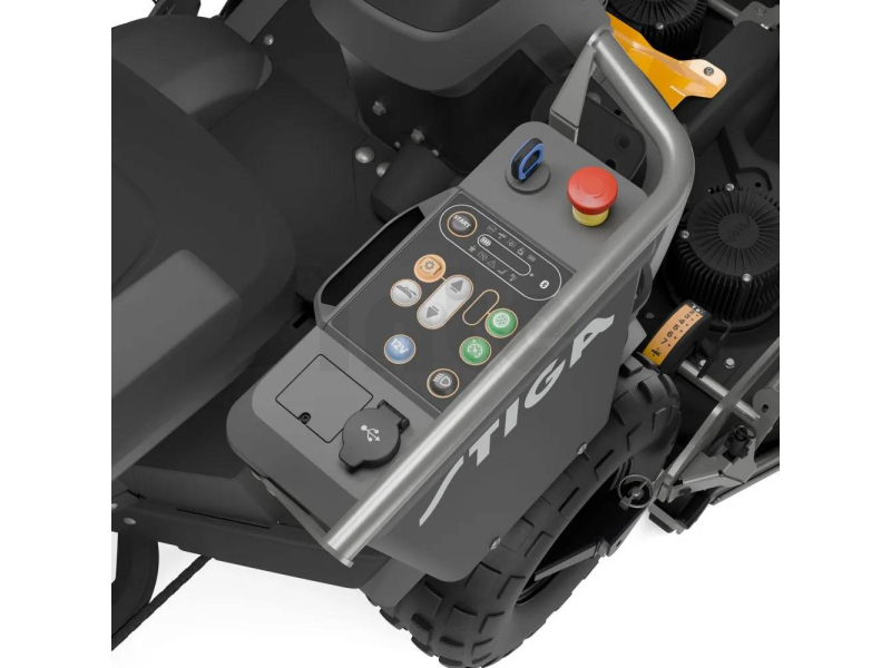 Ovládání je plně digitální – přes palubní panel i aplikaci STIGA.GO, kde máte kompletní kontrolu nad výkonem, bateriemi i provozem. Ergonomické sedadlo s opěrkami a intuitivní rozložení prvků zajišťují maximální komfort i při celodenní práci.