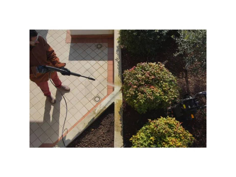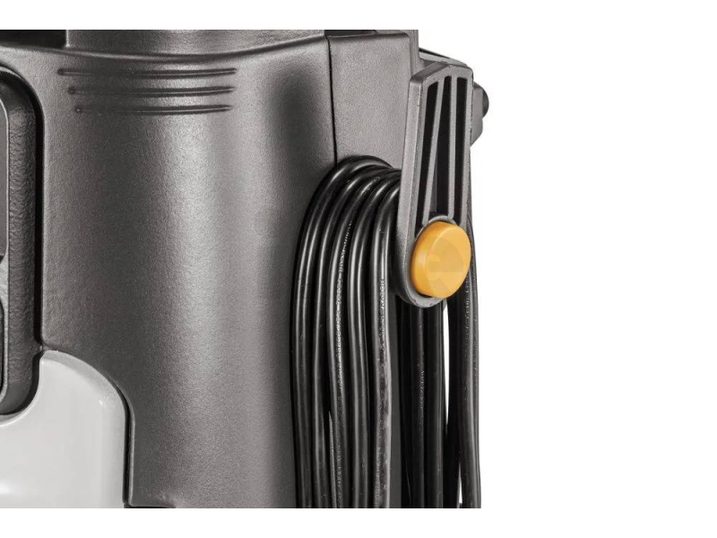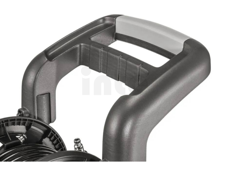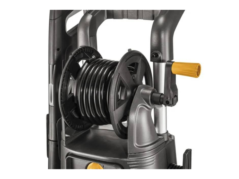 Velkou výhodou je 9metrová vysokotlaká hadice s integrovaným navijákem, která poskytuje dostatečný dosah a zároveň umožňuje snadné skladování bez zamotání. Praktická kliková rukojeť usnadňuje její navíjení.