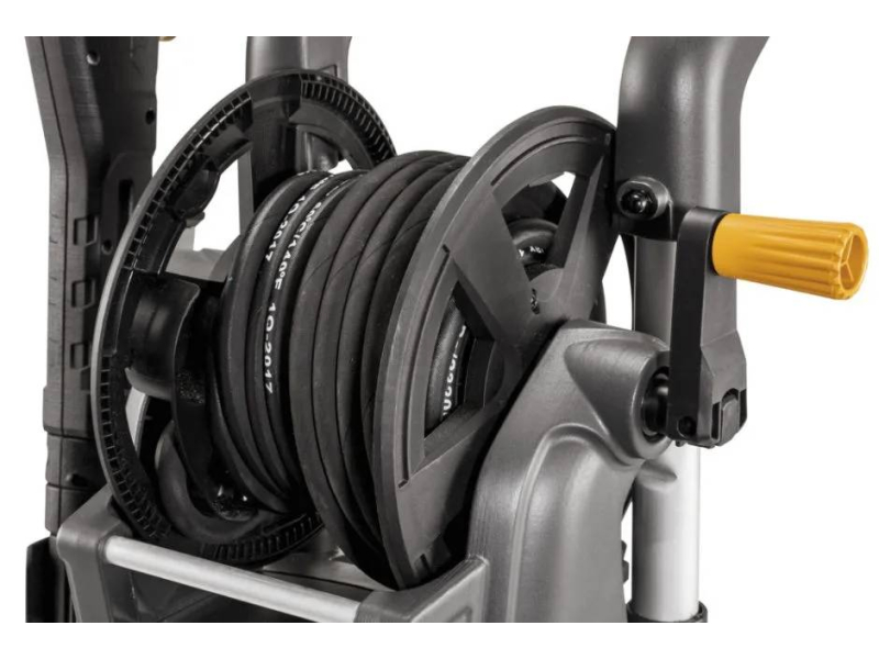Velkou výhodou je 12metrová zesílená vysokotlaká hadice, která poskytuje maximální dosah bez nutnosti častého přemisťování stroje. Integrovaný naviják s hliníkovými vodítky zajistí snadné a rychlé uskladnění.