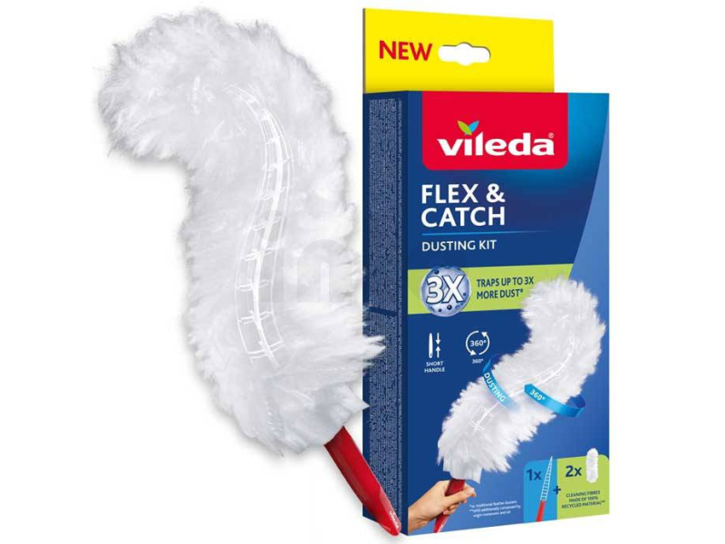 Vileda Flex & Catch prachovka s krátkou rukojetí je ideálním pomocníkem pro rychlé, důkladné a ekologické odstraňování prachu v celé domácnosti. Díky inovativní ohebné 360º hlavici zachytí až 3× více prachu než tradiční péřové prachovky a snadno dosáhne i do těžko dostupných míst, jako jsou police, žaluzie, zrcadla nebo rohy nábytku. Hlavice je vyrobena ze 100 % recyklovaných vláken, která zajišťují šetrný, ale zároveň mimořádně účinný úklid. Ergonomická krátká rukojeť poskytuje pohodlné držení a maximální kontrolu při čištění. Systém pevného zacvaknutí zaručuje, že hlavice během úklidu drží bezpečně na místě. Vileda Flex & Catch spojuje výjimečný výkon, udržitelnost a snadné použití – pro dokonale čistý a zdravý domov bez kompromisů.