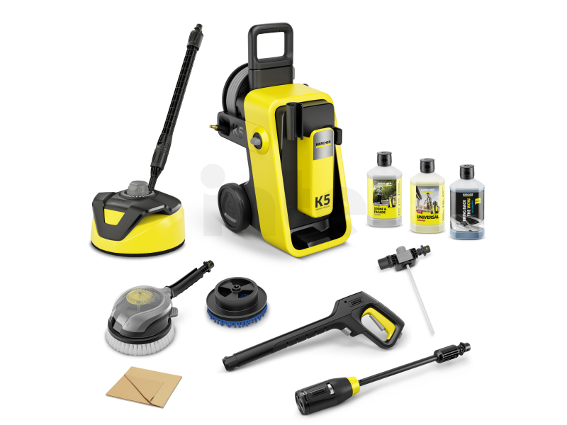 Součástí balení je Home Kit s čističem povrchů T 5 a čisticím prostředkem na kámen a fasády, stejně jako Car Kit s rotačním mycím kartáčem, mikrovláknovou utěrkou a autošamponem. Integrovaný buben s flexibilní hadicí PremiumFlex (10 m) zajišťuje pohodlnou manipulaci a maximální volnost pohybu.