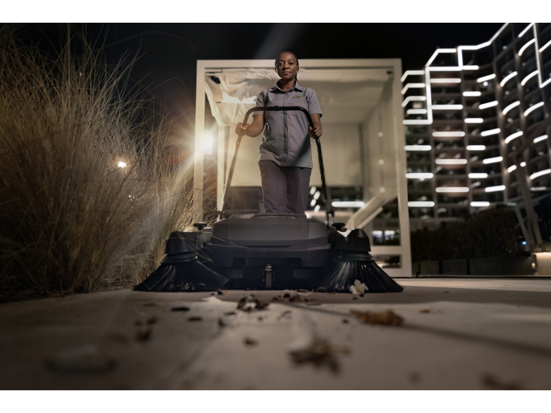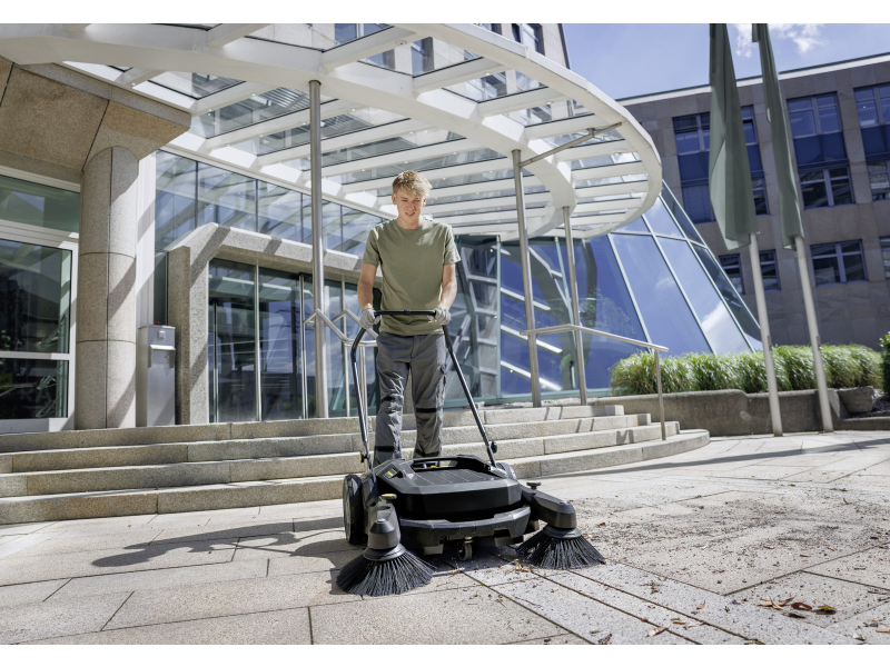 Díky kombinaci dvou bočních kartáčů a hlavního zametacího válce dosahuje stroj až 9× vyššího výkonu než běžné koště. Pracovní šířka až 980 mm umožňuje rychlé a efektivní zametání velkých ploch, a to bez použití elektrické energie – ruční pohon umožňuje provoz kdykoli a kdekoli.